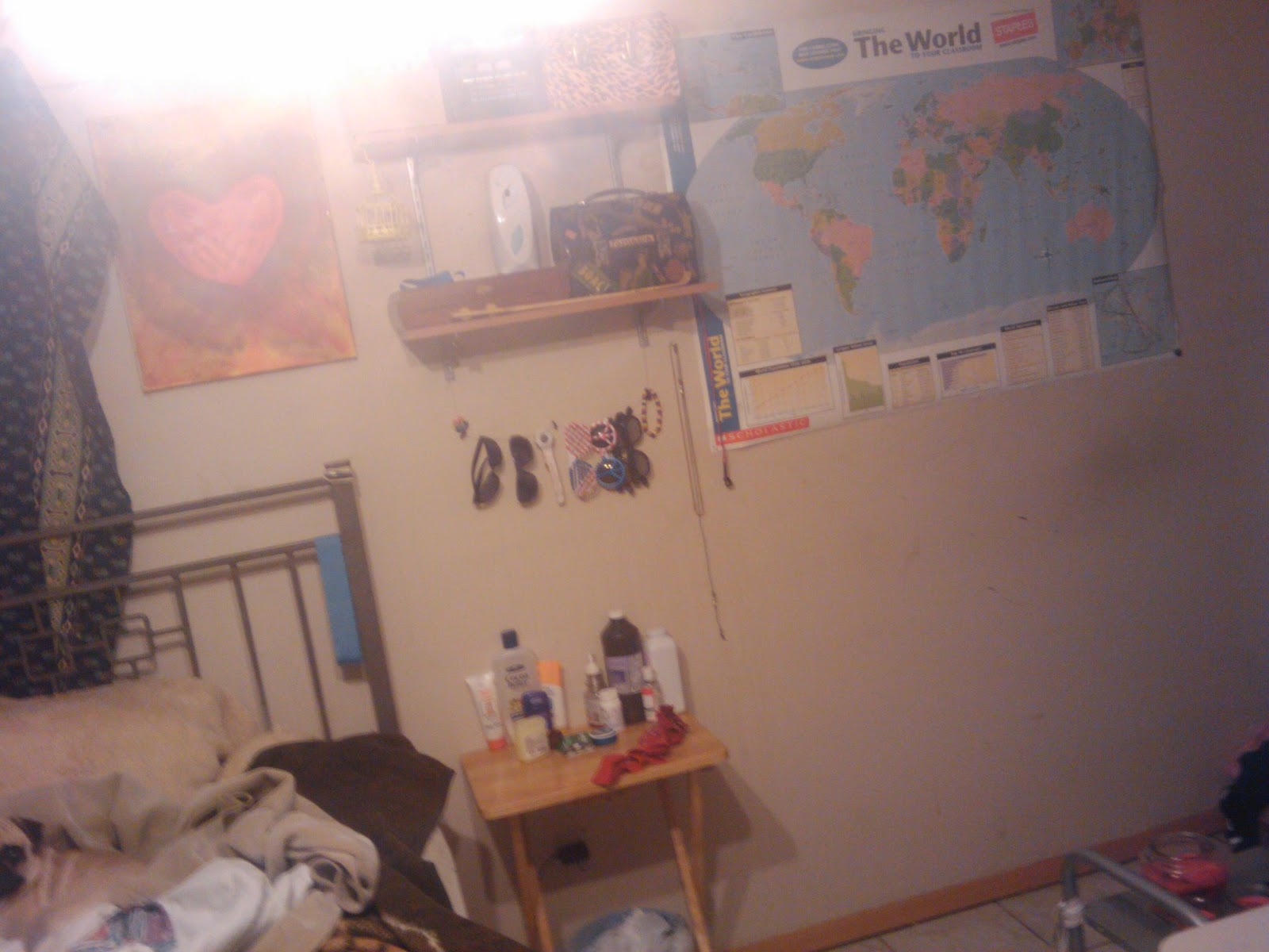 Gizmo chilling on my messy bed, the psychedelic wall hanger I've had forever! It even survived Bonnaroo 2010 - Love that shit!
